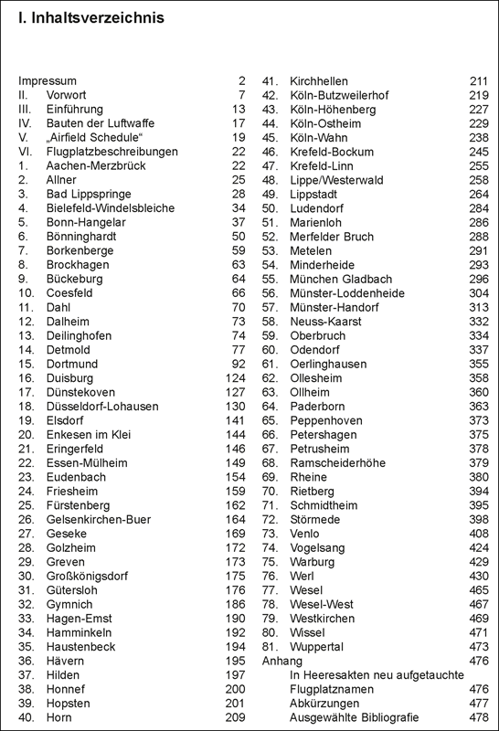 Die Liste der im Band abgedeckten Flugplätze kann dem Auszug des Inhaltsverzeichnisses entnommen werden (siehe Bild).