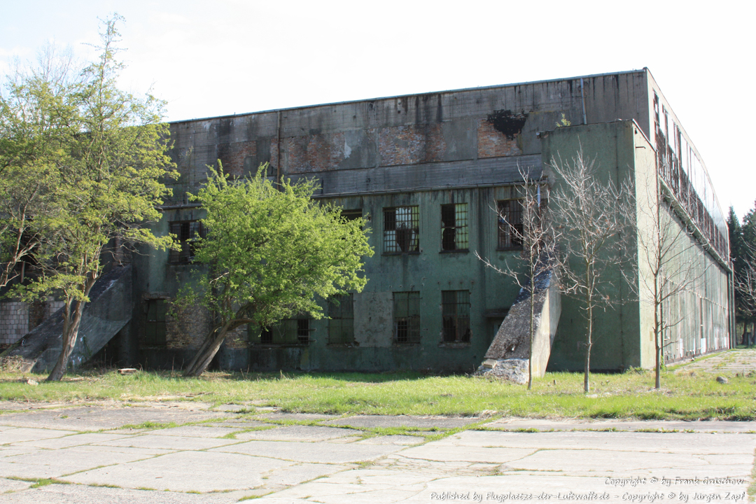 In der folgenden Aufnahme, die die Halle von Süd-Westen her zeigt, ist – trotz späterer Übermalung – noch deutlich der Pfeil unterhalb der Turmkanzel zu sehen, der einst die Besatzungen der landenden Seeflugzeuge auf die Flugleitung hinwies.