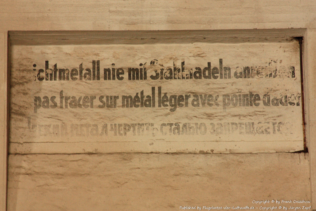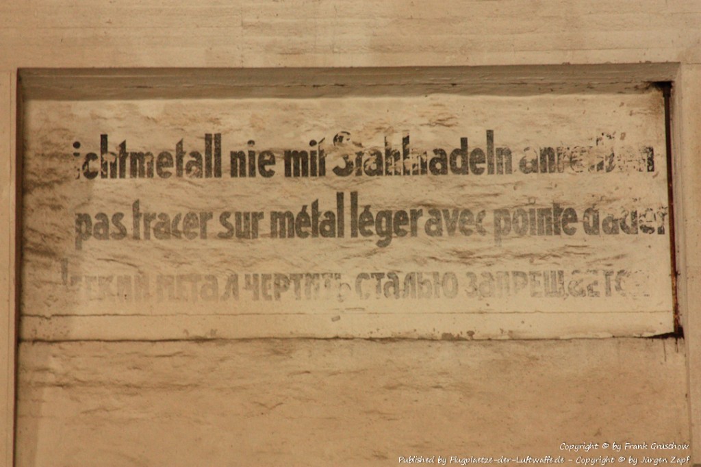 Dieses alte Hinweisschild belegt, dass in der Halle Kriegsgefangene und Zwangsarbeiter von Heinkel und Bachmann zu Produktionszwecken eingesetzt wurden.