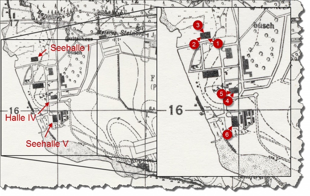 Der besseren Übersicht halber sind die Aufnahmeorte der Aufnahmen 1 – 6 auf einer Karte des Fliegerhorstes eingetragen worden.