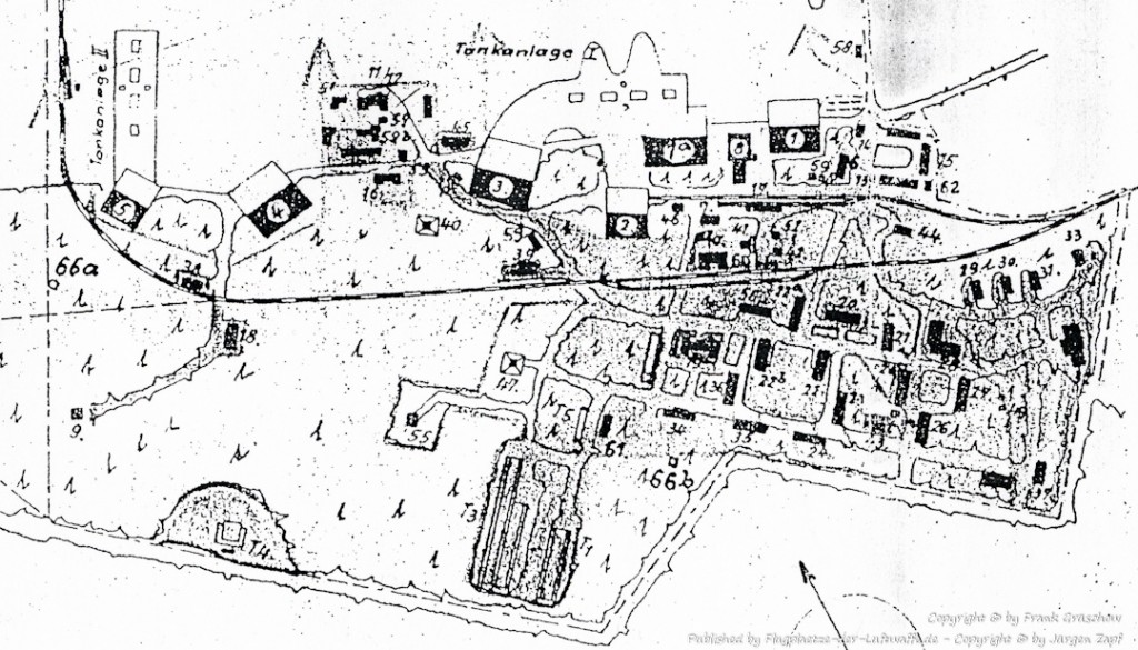 Eine weitere – handgezeichnete – Skizze der Gebäude wurde mir vor Jahren durch einen ehemaligen Angehörigen des Fliegerhorstes zur Verfügung gestellt. Bis auf die Gebäude rund um die Flugleitung (in der Handskizze die Nummern 11/12) und die Flugzeughallen sind alle Anlagen inzwischen verschwunden.