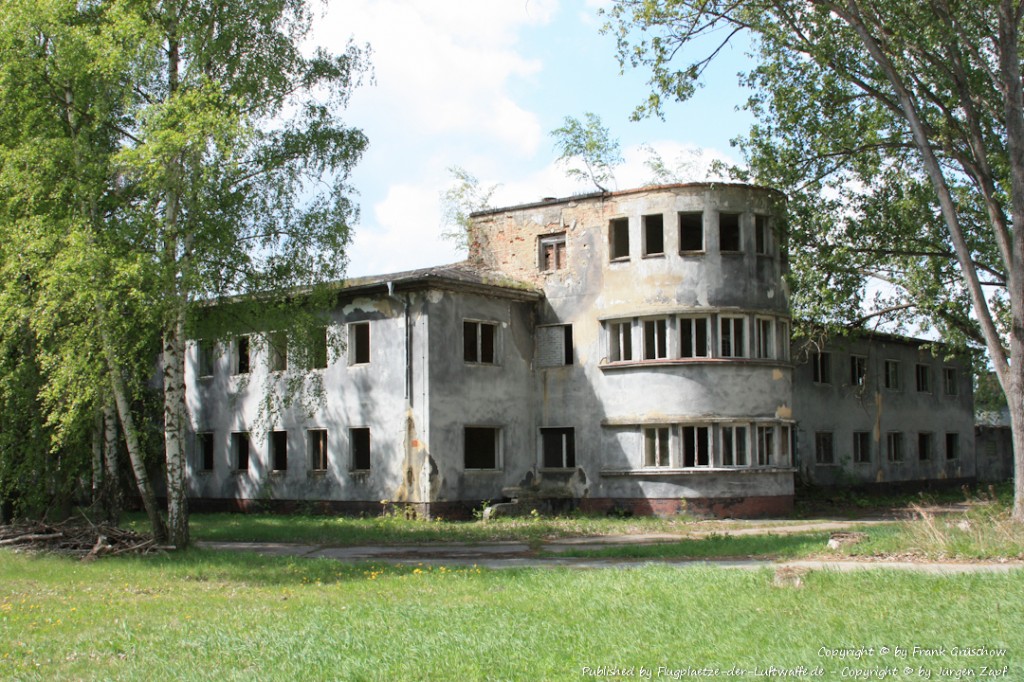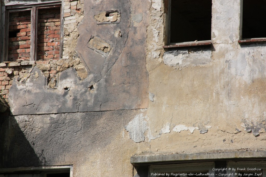 Als eines der wenigen erhaltenen Gebäude entpuppt sich die ehemalige Flugleitung (auf der Handskizze die Nummer 11/12, auf der Foto-Übersicht die Aufnahmen 2 und 3) mit ihrer charakteristischen Front.