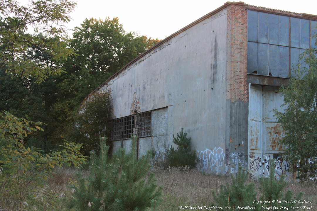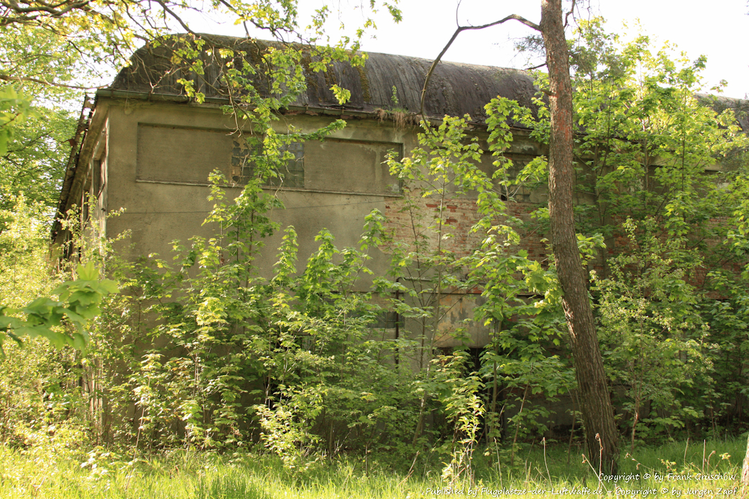 Vergleicht man diese und die folgenden Aufnahmen mit dem von mir 2001 veröffentlichten Foto2, so ist unschwer der zunehmende Bewuchs um die Halle herum sowie die allgemeine Verschlechterung der Bausubstanz erkennbar. Selbst das halb geöffnete Tor der Halle scheint in den vergangenen zwei Jahrzehnten nicht bewegt worden zu sein.