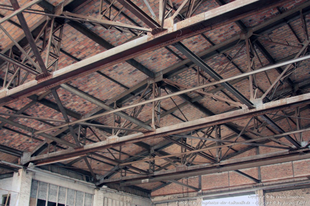 Betritt man die alte Werfthalle, zeigt sich deren Konstruktion um ein Stahlfachwerkgerüst herum, welches nach außen hin mit Ziegeln ausgemauert wurde.
