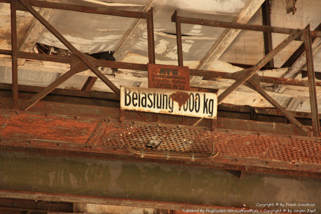 Der auf der vorangegangenen Aufnahme sehr schön sichtbare Deckenkran ist auch heute noch “an Ort und Stelle”, auch wenn er seit langem keine Lasten mehr angehoben hat. Sehr schön sind in der Detailaufnahme noch Tragkraft und Hersteller abzulesen.