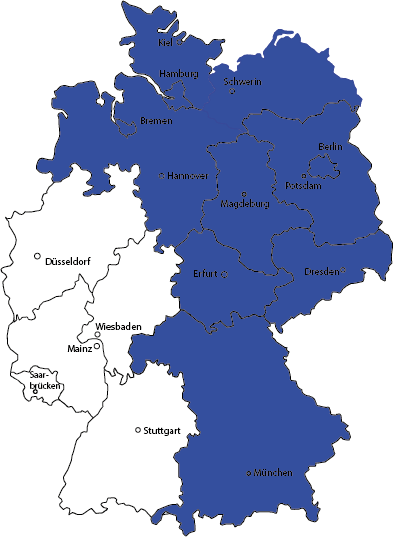 Damit sind nun weite Teile des heutigen Bundesgebiets abgedeckt – die Grafik zeigt all momentan besprochenen Bundesländer in Blau, noch nicht abgedeckte Bundesländer in Weiß.