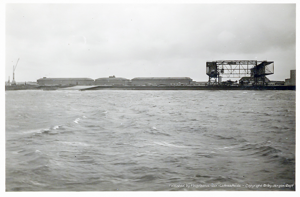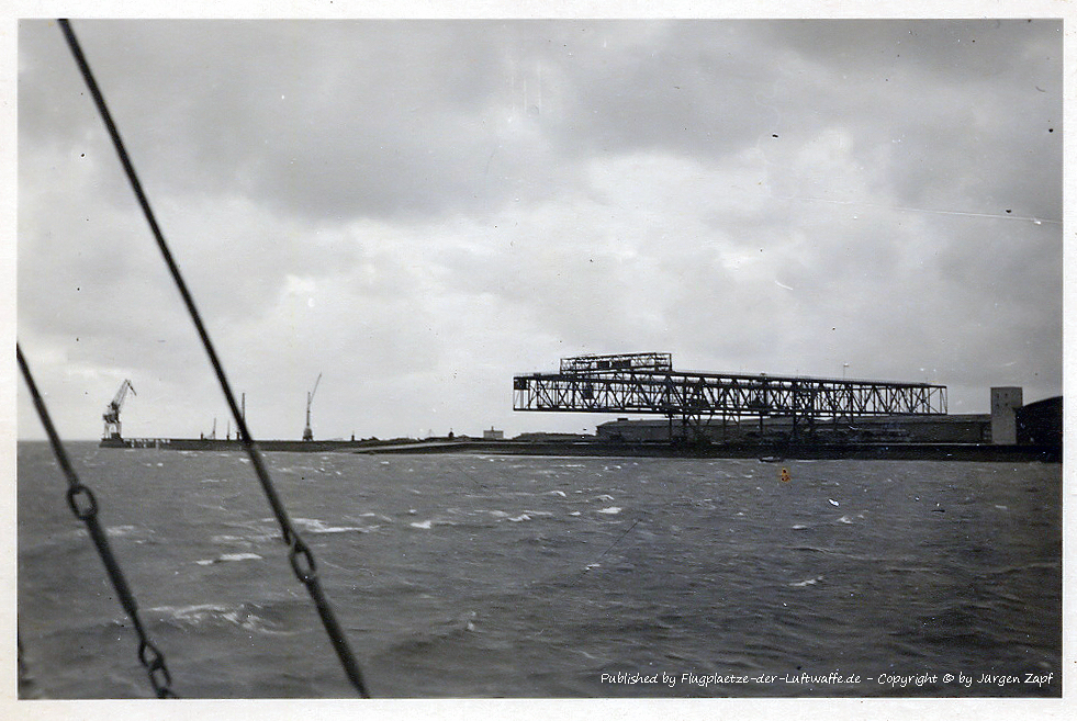 Es handelt sich um den Seefliegerhorst Norderney und die Aufnahmen wurden kurz nach der Errichtung der Halle „Dora“ und des großen Portal- oder Kastenkrans etwa im Jahr 1938 gemacht.
